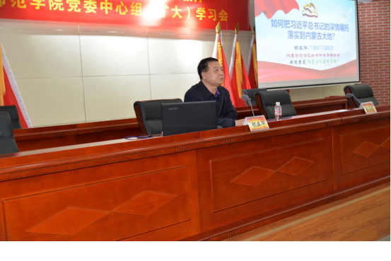 为深入贯彻习近平新时代中国特色社会主义思想和党的十九大精神,深入学习宣传贯彻落实习近平总书记考察内蒙古和参加全国人大内蒙古代表团时发表的重要讲话精神,进一步统筹推进“不忘初心,牢记使命”主题教育工作在PP电子游戏官网的落实,9月27日,PP电子游戏平台网站党委中心组召开(扩大)学习会,特邀内蒙古自治区社会科学界联合会巡视员胡益华教授为PP电子游戏官网全体党员解读“如何把习近平总书记的深情嘱托落实到北疆大地?”党委副书记、校长朱玉东主持学习会。