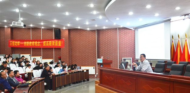 王恒老师的讲座主要从教师的智慧、积极的人生态度、职业认同和专业发展、发展自己的优势——“中指意识”、培养做大教师的胸襟五方面展开。他认为,教师在教育学生的同时要提升自己的事业境界和人生品位;在学生成长和成功的同时应该不断成长,要感受到职业带给自己的幸福感。他还认为,教师应善于学习,培养自己的精神力,用自己的个人修养来影响学生,将关心爱护学生与严格要求相结合,做平和的、真诚的;、朴素的、有感召力的老师。王恒老师最后强调,教师要在日常的工作中学习、实践、总结、研究、创新、超越。