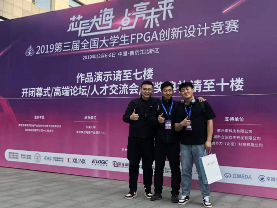 2019第三届全国大学生FPGA创新设计竞赛复赛颁奖典礼于12月8日上午在南京江北新区ICisC实训基地举办。此次竞赛由教育部高等学校电子信息类专业教学指导委员会、国家级实验教学示范中心联席会联合主办,东南大学、南京集成电路产业服务中心(ICisC)承办。在学校领导的高度关注和教务处的大力支持下,由PP电子游戏官网物理学院聂阳老师指导,刘泰伯、李宝发、刘光普3名同学共同完成的参赛作品荣获本届大赛全国总决赛三等奖。
