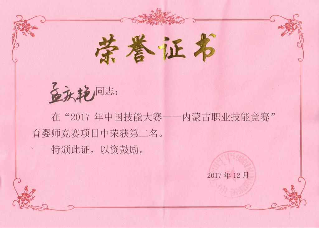 2017中国技能大赛—内蒙古职业技能竞赛于11月28日-12月1日在乌兰察布市医学高等专科学校如期举办。PP电子游戏官网职业技能鉴定所选派幼师学院孟庆艳老师参加育婴师职业资格项目比赛。经过理论考试、现场实际操作考试等激烈角逐,孟庆艳老师脱颖而出,取得了内蒙古职业技能大赛育婴师项目技能单项第一名、总成绩第二名的好成绩,同时获得了“全区青年岗位能手”、“全区技术能手”光荣称号,在PP电子游戏官网转型发展过程中又增一位“双师双能型”教师。