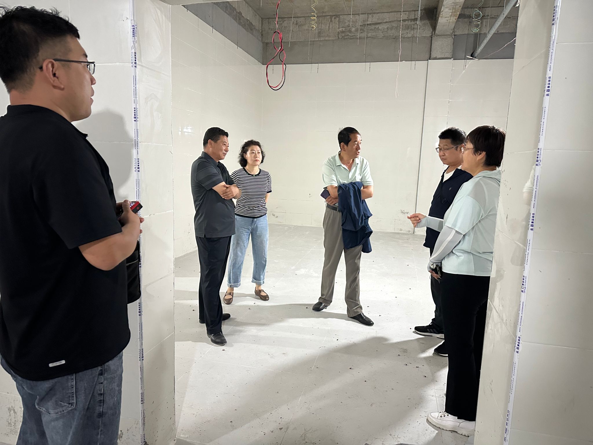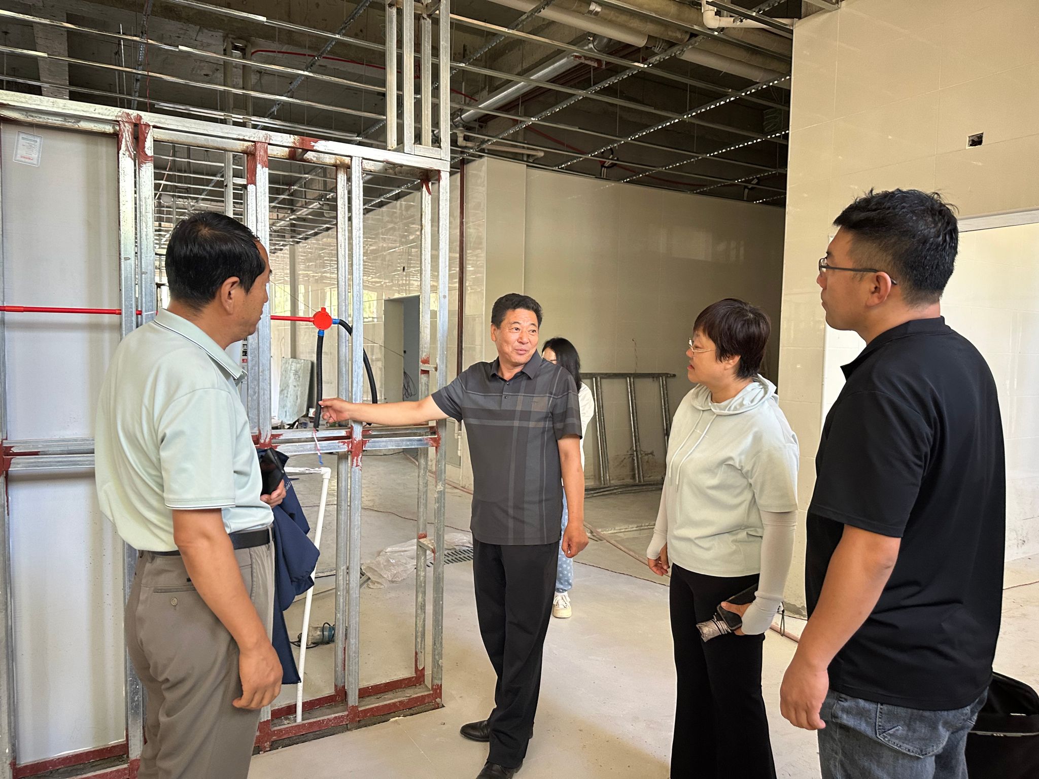 大家实地察看了学生洗浴中心改建项目施工现场的建设情况,听取了第三方审计单位负责人对工程进度的监督和施工细节的情况说明。调研中对发现的问题提出了建议意见,要按照学校领导要求的切实履职尽责,秉持“高标准建设、高质量管理”原则推进工程建设,全面加强工程管理和监督,严把质量关、安全关,进一步加快项目扫尾进度,持续推进配套设施的按时安装任务。