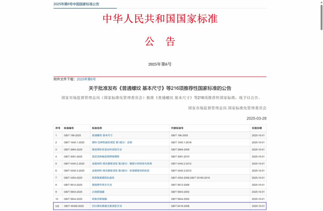 2025年3月28日,中华人民共和国国家标准网站发布公告(2025年第6号),国家市场监督管理总局、国家标准化管理委员会联合批准了国家标准《凹凸棒石微量元素测定方法》,该国家标准《凹凸棒石微量元素测定方法》将于2025年10月1日正式实施。