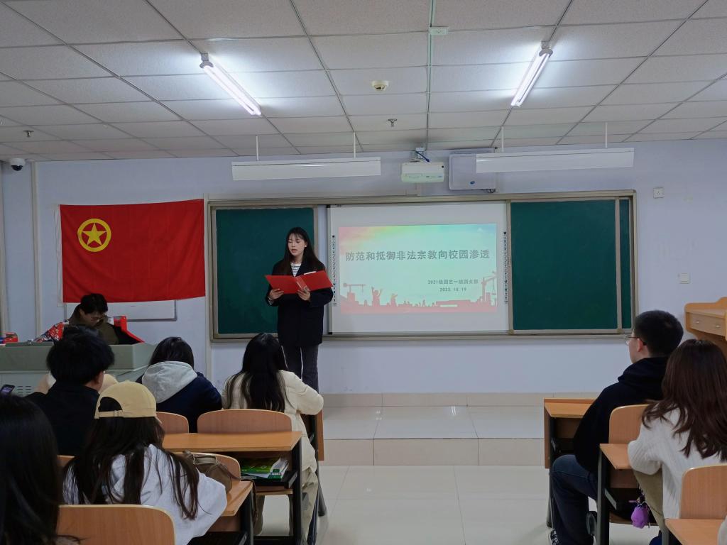 为全面学习贯彻党的二十大精神,培育和践行社会主义核心价值观,切实守好校园意识形态阵地,严防宗教向校园渗透,2023年10月19日我院党总支副书记张明东老师参加了2021级园艺一班团支部组织开展的“防范和抵御非法宗教向校园渗透”主题团日活动。
