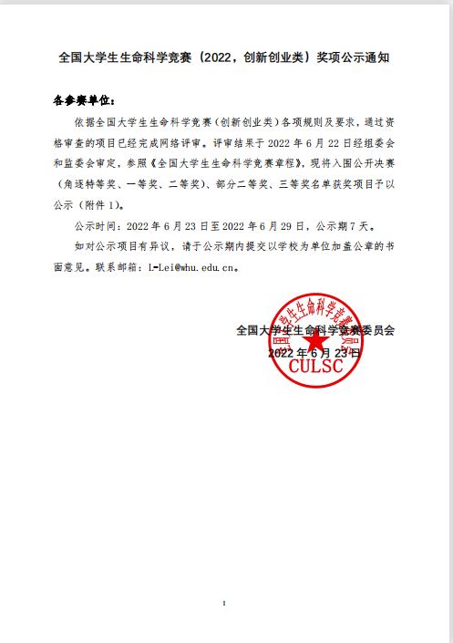 齐悦等5位同学在2022年全国大学生生命科学竞赛(创新创业类类)中获得国家级三等奖。