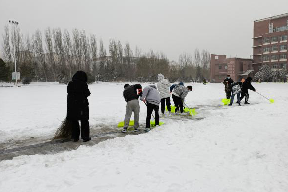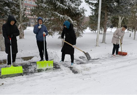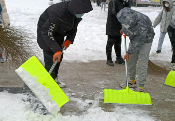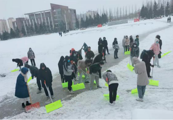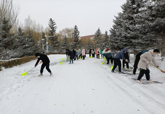 参加扫雪的同学们,早早到指定地点集合,自动分组,积极投入到除雪队伍中。大家齐心聚力,铲的铲、推的推,不畏严寒,挥舞着铁锹对主教楼附近及路上的积雪和结冰进行清理。同学们相互帮助、其乐融融的劳动热情给寒冷的冬天带来了浓浓的暖意。