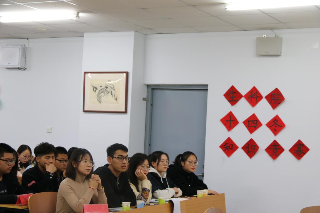 为大力宣传中华人民共和国第十四届冬季运动会,激发我院学子对冬运会的热情,主动关注并了解冬运会,生命科学学院于2019年11月10日19时在逸夫楼201室成功举办“十四冬”知识竞赛。担任本次比赛的评委有生命科学学院团总支副书记刘金、青协分会会长武佳欣、青协分会副会长兼学生会副主席薛丽梅、学生会副主席刘殿宇和郑秀文。