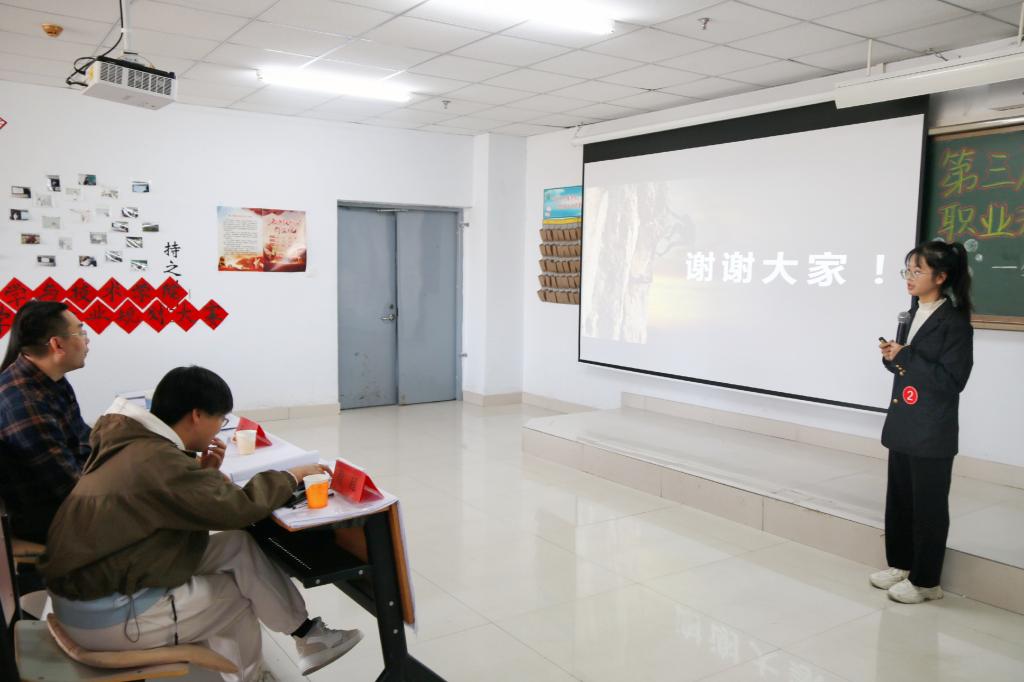 比赛分为成长赛道和就业赛道两个赛道,9名复赛选手全部选择了成长赛道参加比赛。参赛选手首先进行职业规划PPT设计展示,每位选手热情激昂、条理清晰地讲解了自己的职业规划,展示出当代大学生锐意进取的良好精神风貌。接下来评委老师根据选手们的综合表现进行随机提问,选手们机智、敏捷地作出回答,表现出对自己职业生涯规划的自信。