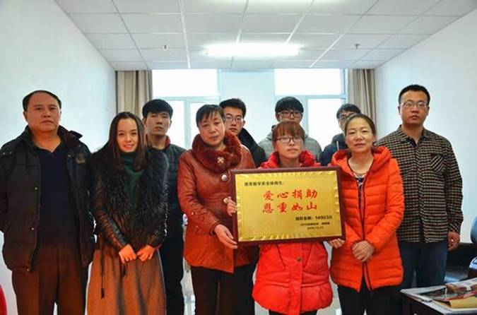 近日,数学系党总支组织全体师生开展了献爱心活动。郝艳霞是数学系2013级数学与应用数学一班的学生,生活在一个重组家庭。61岁的父亲不幸患上喉癌,无钱医治。为救病重的父亲,郝艳霞同学准备辍学打工,为父亲筹钱治病。为帮助郝艳霞解决生活上的困难且顺利完成学业,数学系党总支组织了捐款活动,师生累计捐款金额达14903元。2016年 1月5日下午,在泉山校区逸夫楼,数学系领导和师生代表慰问了郝艳霞母亲,并将善款交到了郝艳霞母亲的手里。