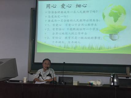 毛秀明做了题为“疑探教学法在高中数学中的应用”的讲座,通过具体案例讲解了高中数学教学中采用的新教法;王旭花做了题为“用心、 爱心、 细心”的讲座,讲解了初中阶段学生在身体外形、学习心理、情感体验、意志品格等方面的特征以及初中教师在培养学生时应注意的问题;王平做了题为“如何做一名合格的数学教师”的讲座,阐述了作为一名合格数学教师所具备的条件。