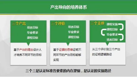 本次师范类专业认证,OBE是专业人才培养体系设定的原则性理念,即“产出导向的人才培养体系”,认证关注点可以概括为“三个三”