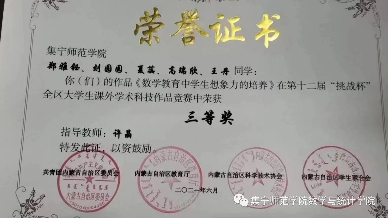 良好的班风、学风是取得优异成绩的前提,同学们的共同努力是取得优异成绩的保证。班级内各个班委分工明确,责任到人,班级日常管理稳定有序。同学们经常在一起探讨学习上的问题,互帮互助,共同进步。在院领导组织的班级上课情况抽检中,该团支部上课纪律良好且未出现缺课的情况。2020年获得数学与统计学院“团结奋进班集体”。该团支部同学的荣誉也是数不胜数,如:2020“开拓杯”校园文学综合实践获奖同学共计27人,获内蒙古自治区2020“开拓杯”英语作文大赛奖共计27人,获内蒙古自治区2021“开拓杯”英语作文大赛奖共计36人。