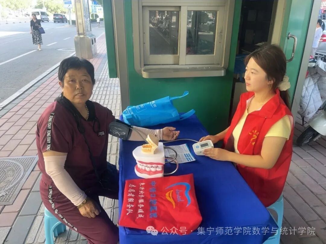 2023级数学与应用数学二班张婉皎满怀热忱地为当地老年人提供志愿服务。她一边细心地为老人们测量血压,一边耐心叮嘱注意事项,还贴心送上实用的牙齿护理工具,用温暖举动传递真切关怀,让实践充满浓浓暖意。