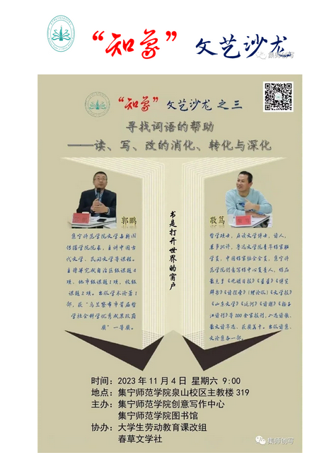 本期沙龙,在结合大学生劳动教育课程改革基础上,围绕大学生文学创作中的“读、写、改的消化、转化、深化”问题展开讲述,首先郭鹏以《如何创作格律诗?》为题,谈到古人对音韵的重视,讲究平仄,同时结合自身创作经历,指出在诗中应该如何遵循押韵的规律及原则;敬笃则从活动的主题出发,提出怎么读?怎么写?怎么改?是我们在写作的道路上要完成的三个重要环节,而后又以《如何创作出好的故事?》为题,以经典小说为案例,阐述了小说写作的准备、谋篇布局和好故事的基本要素三个方面展开讨论。
