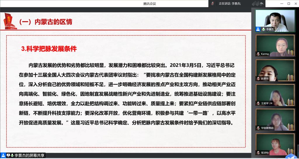 6月1日,PP电子游戏平台网站党委委员、副校长李景杰为2021级学前教育1班和小学教育1班讲授“铸牢中华民族共同体意识”课程第十个专题“建设亮丽内蒙古共圆伟大中国梦”。