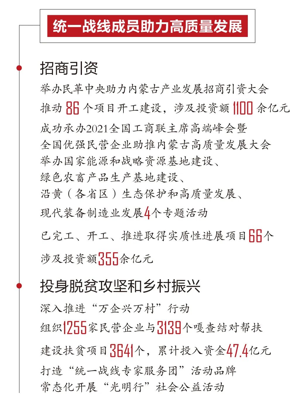 组织统一战线成员助力高质量发展,引导民营企业和港澳台侨资企业走进内蒙古、投资内蒙古、兴业内蒙古。举办民革中央助力内蒙古产业发展招商引资大会,推动86个项目开工建设,涉及投资额1100余亿元人民币。成功承办2021全国工商联主席高端峰会暨全国优强民营企业助推内蒙古高质量发展大会,举办国家能源和战略资源基地建设、绿色农畜产品生产基地建设、沿黄(各省区)生态保护和高质量发展、现代装备制造业发展4个专题活动,已完工、开工、推进取得实质性进展项目66个,涉及投资额355余亿元。