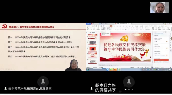 教研活动中,承担2021—2022学年第二学期《铸牢中华民族共同体意识》课程授课任务的全体教师根据师范类认证相关要求,对照人才培养方案和教学大纲,以说课形式分专题进行了教学内容、教学教法深度研究,开展了学期初线上教学讨论。