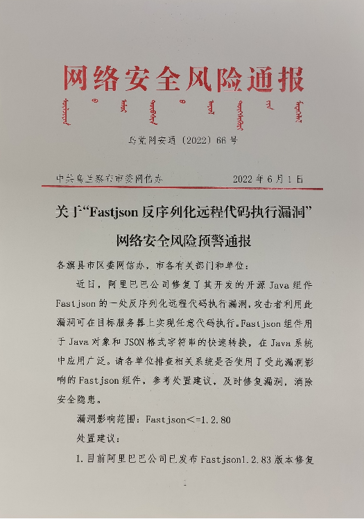 关于“Fastjson 反序列化远程代码执行漏洞”网络安全风险预警通报