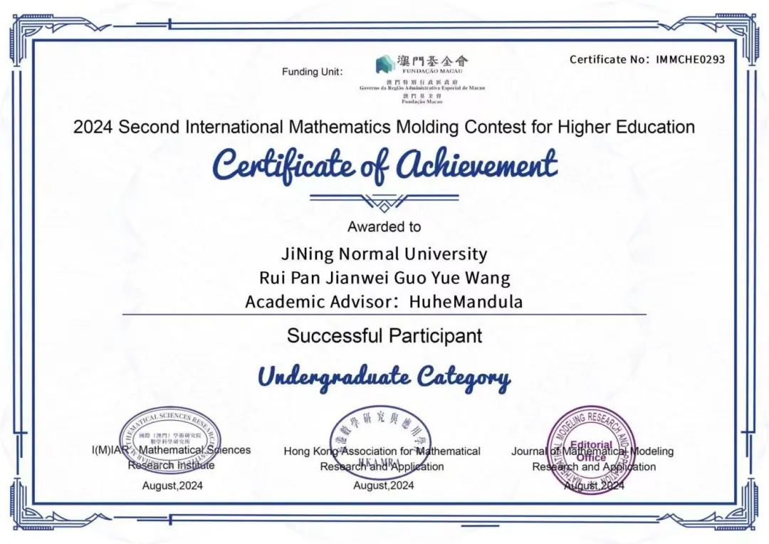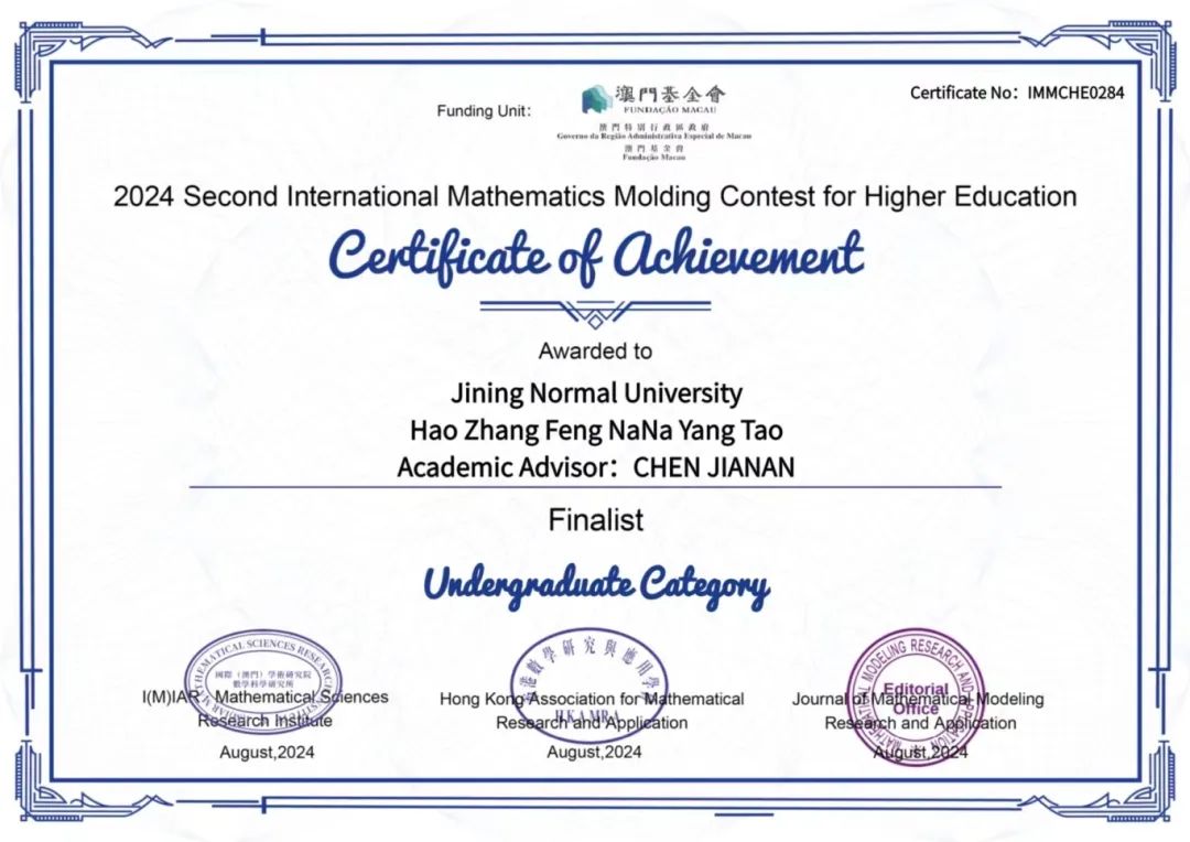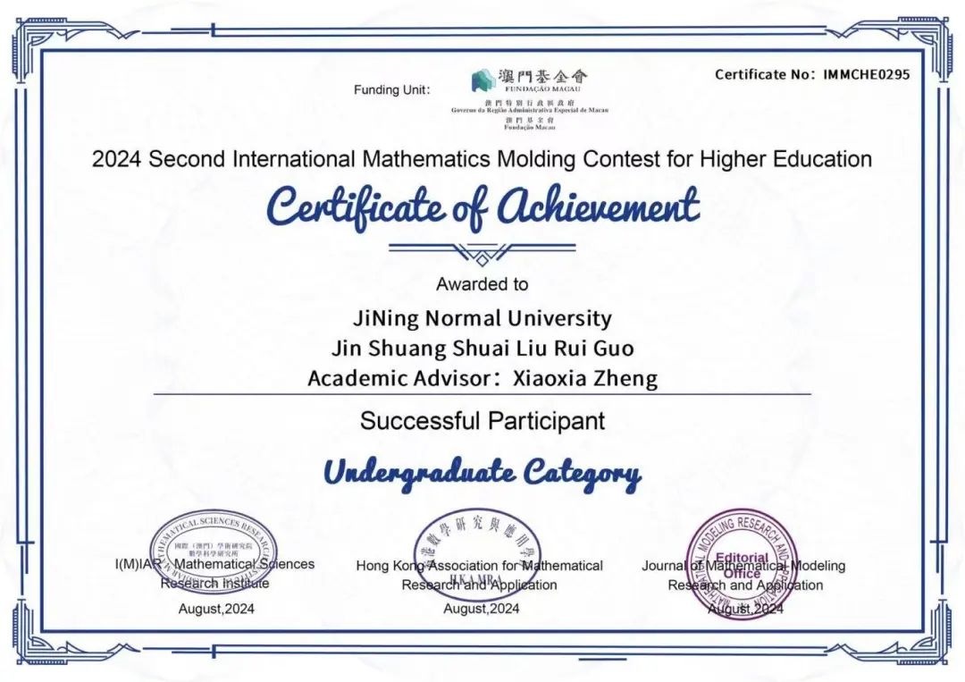 为了在学术的浩瀚星空中绽放光芒,为了追寻心中的梦想与激情,物理与电子信息工程学院的学子们不断探索前行。我院共有五支队伍报名参加2024年国际高校数学建模竞赛,此项竞赛是国际(澳门)学术研究院数学科研研究所、数学建模研究与应用期刊社联合香港数学研究与应用学会主办,为列入澳门特别行政区政府澳门基金会(行政长官直属)立项资助名单的国际学科竞赛,旨在培养学生数学应用、创新意识与团队协作的能力。此项竞赛于2024年7月26日20时开始,持续四天于2024年7月30日20时结束。我院15名学生在这场激烈的角逐中全力以赴,最终脱颖而出,成绩斐然!