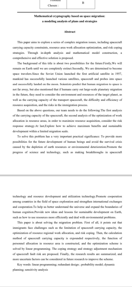 此次竞赛中,我院学子们运用了扎实的英语写作能力、数学建模能力、逻辑推理能力以及团队协作能力等多种综合能力,指导教师从多角度指导学生完成竞赛。最终团队成员分工合作完成了英文版数学建模论文。每组队员从各自对问题的分析角度出发,建立起了数学模型,解决了竞赛中设置的问题。英文论文中框架结构搭建合理,摘要简明扼要、英文运用合理且贴切。此次比赛充分展现了我院学子具备扎实的专业知识、卓越的创新能力和顽强的拼搏精神。