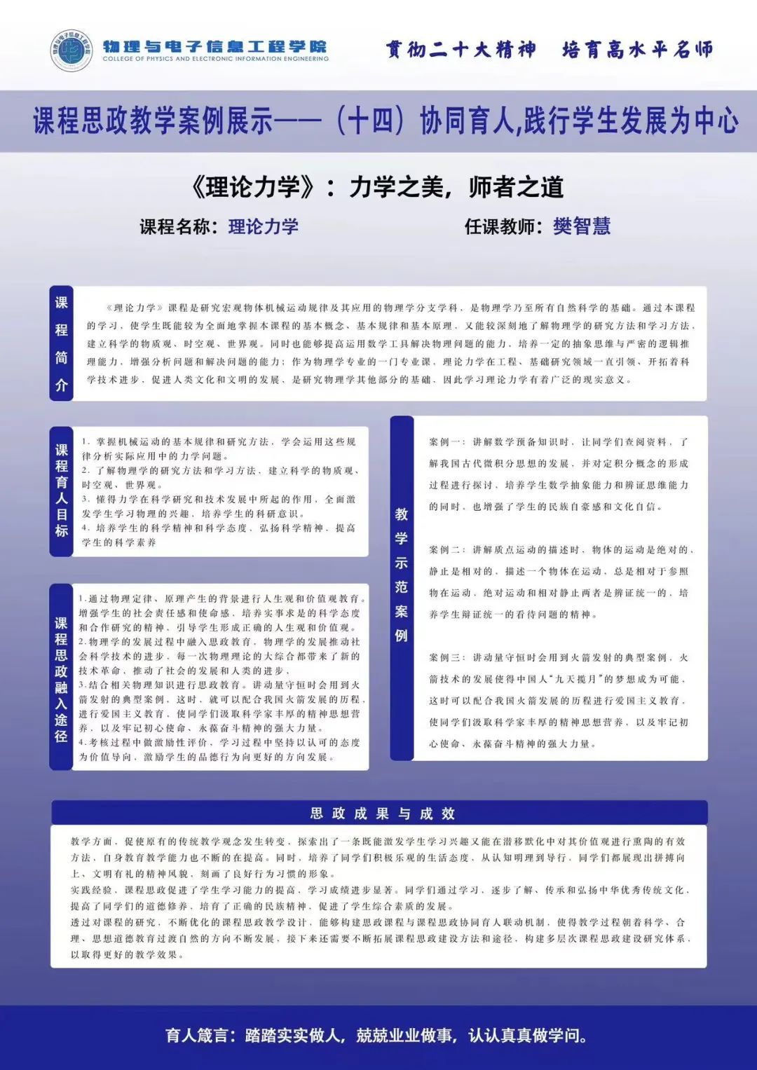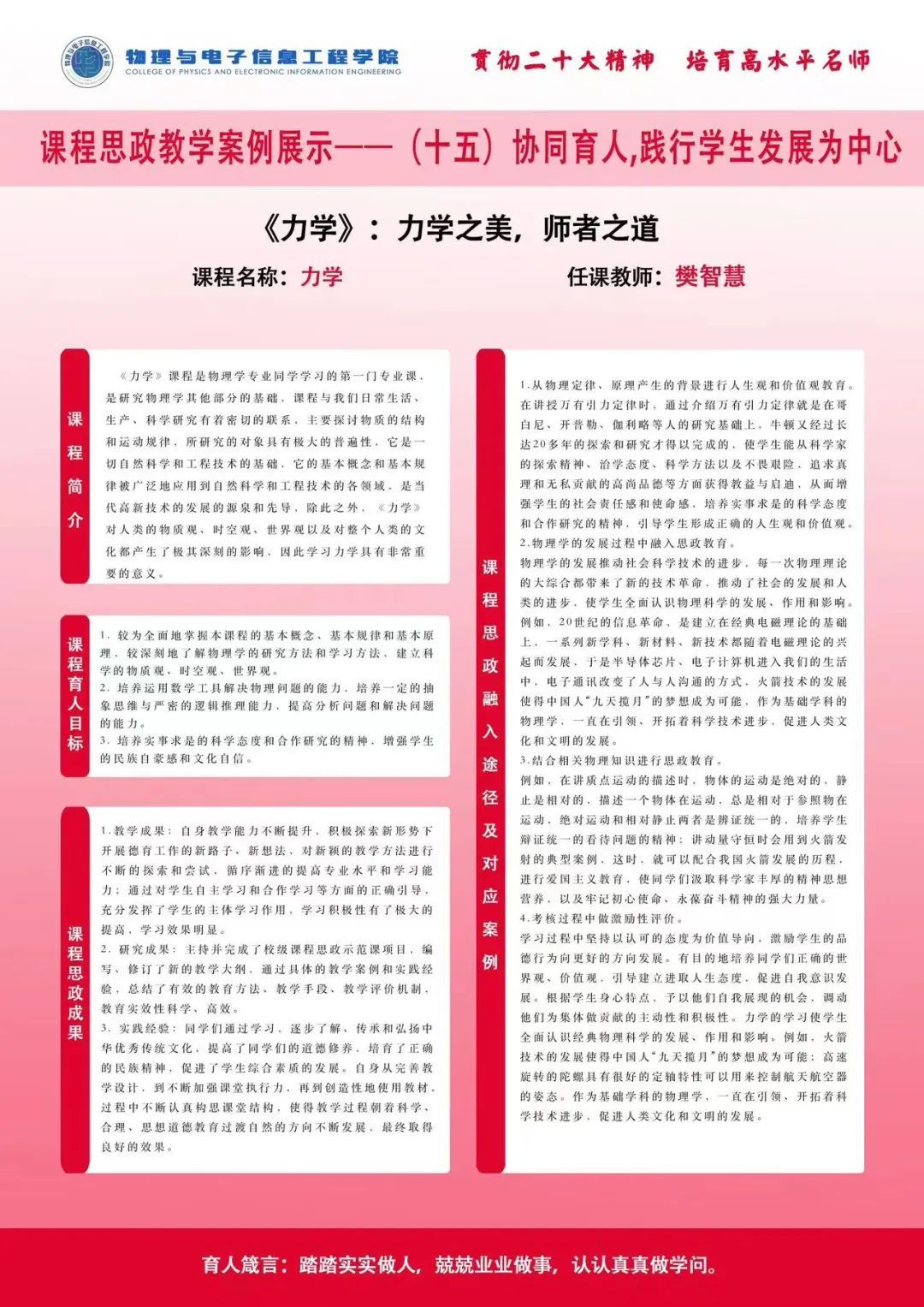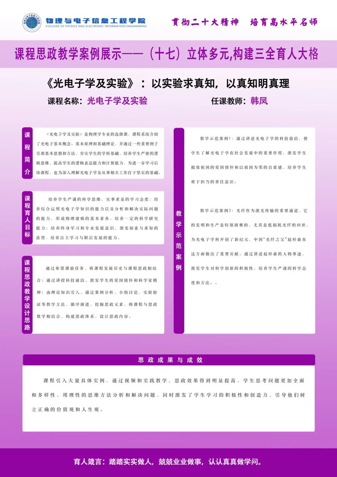 为践行为党育人、为国育才的崇高使命,物电院紧扣立德树人根本任务,推进习近平新时代中国特色社会主义思想进教材进课堂进头脑,全面推进课程思政建设,将课程思政元素充分融入到课程教学目标和教学过程中,使每门课程都有思政元素,每节课堂都有育人功能。学院通过开展系列“三全育人理念下物理与电子信息工程学院课程思政教学探索”活动,全面推进学院课程思政课堂教学改革,不断提升教师政治素质、教育教学水平,形成良好的全员全程全方位育人氛围。