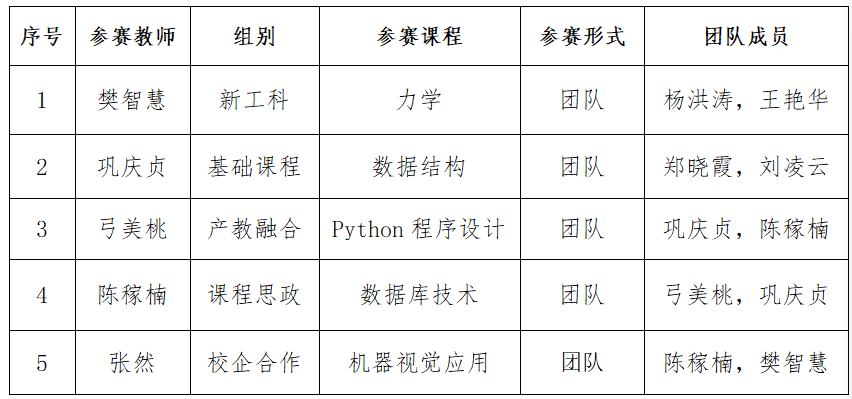 本次比赛学院五支队伍参加五个组别的比赛,前期各支队伍在课堂教学实录视频、教学创新成果报告、教学设计创新汇报三个方面精心撰写文稿,积极筹划、仔细推敲,秉持改革教学理念,思政元素融入课程的教学理念,体现OBE教学方法与教学成果。各支队伍成员多次修改文稿,模拟比赛过程,力争做到在每一个环节做到最优。