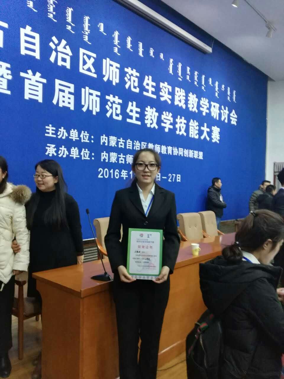 为深化大学生实践教学改革,加强各高校教师教育经验交流。内蒙古自治区教师教育协同创新联盟于2016年11月27日在内蒙古师范大学举办了内蒙古自治区师范生实践教学研讨会暨首届师范生教学技能大赛。由我系教师郭晓霞、马振寰带领2014级物理学班王刚、王海玲两位同学赴呼和浩特市参加了本次比赛。