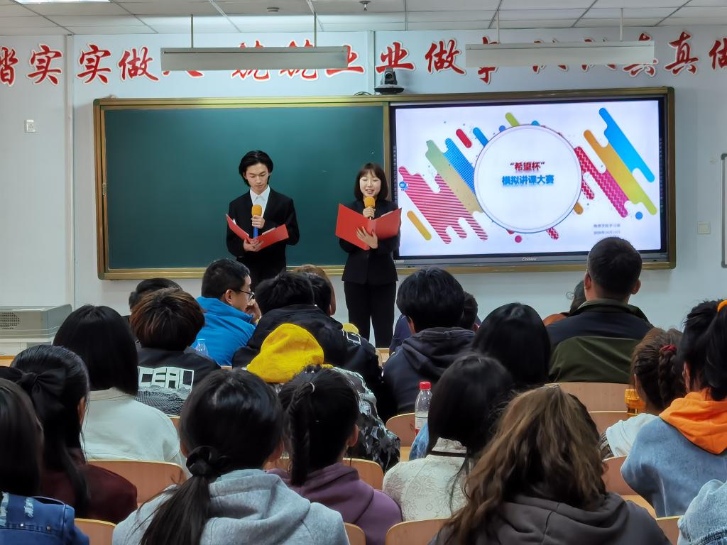 为丰富同学们的课余生活,提高学生的教学实践能力,加深学生对课堂教学的认识和理解,同时为内蒙古自治区第五届师范生教学技能大赛选拔优秀参赛选手,物理学院于10月15日下午3:30在逸夫楼405教室举办了“希望杯”模拟讲课大赛。