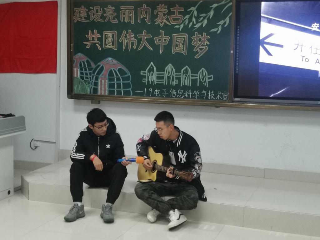 本次团日活动由一段热情似火的开场舞及一段内蒙古与祖国共奋进的视频引入。我们的祖国,美丽而宽广;我们的民族,勤劳而坚强,随后由两名同学给大家带来《我的中国梦》朗诵。活动的内容丰富而多彩,有吉他弹唱《安河桥》、小品《让爱回家》、相声《崇洋媚外》、以及一首首优美动听的音乐,在欣赏节目之余还加入了精心设计的游戏环节,让此次团日活动更加精彩。