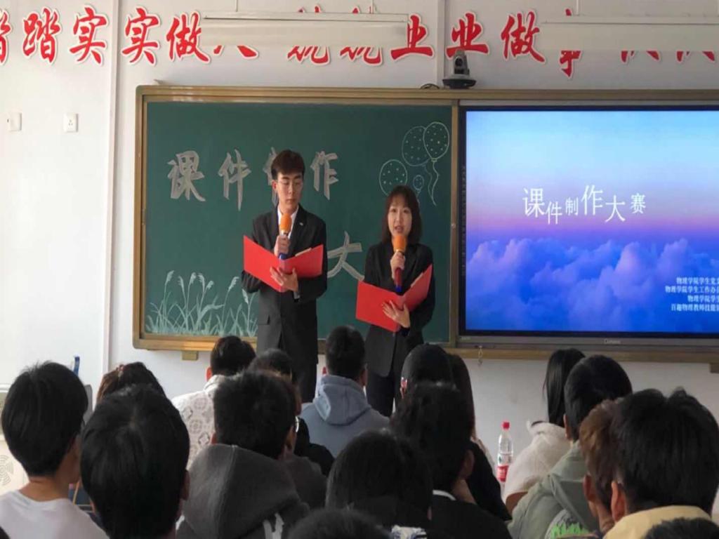 为展示我院学生风采,促进师范生的教师专业化发展、增强同学们应用计算机辅助教学的能力、适应现代化教学的要求及提高学生的课件制作水平。物理学院的学工党支部、学生工作办公室、学生会和百趣物理教师技能协会在2020年10月25日逸夫楼405教室联合开展“课件制作大赛”。