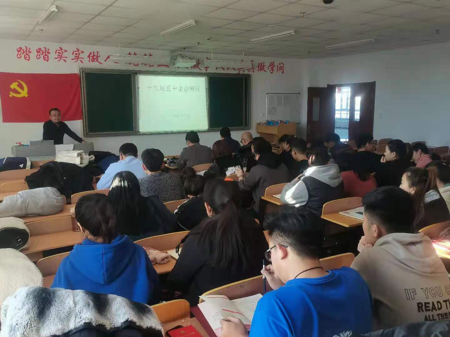 12月15日下午,物理学院党总支在逸夫楼505开展2020年党员教育培训工作第一场——“解读十九届五中全会精神”专题学习讲座。全体教工党员以及学生党员参加了此次培训,本次培训由副院长、教工支部书记董永胜讲授,总支书记韩天荣主持。