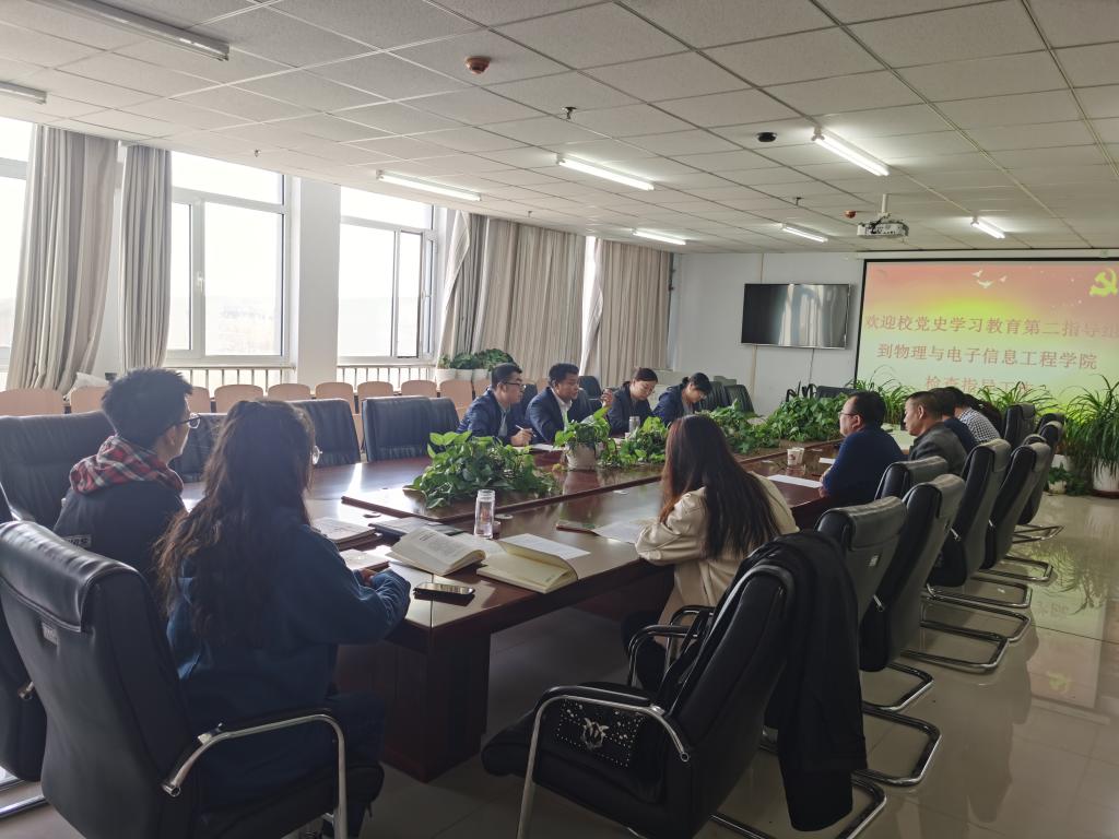 4月14日,学校党史学习教育第二指导组到物理与电子信息工程学院检查指导工作,通过查阅资料、听取汇报,对学院党史学习教育提出指导性意见。