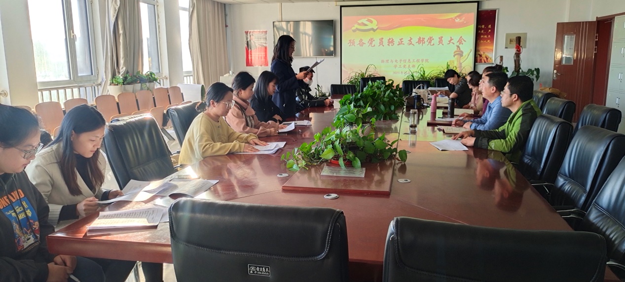 2021年10月15日下午,物理与电子信息工程学院在逸夫楼2Y809召开了党员大会,讨论预备党员转正事项,会议由支部书记马振寰主持,物电院党总支书记董永胜、党总支副书记李刚、副院长葛俊峰以及预备党员的入党介绍人和全体无课党员参加了本次会议。大会采取线上线下相结合的方式,对李林灿等9名预备党员的转正问题进行了充分的讨论,并进行无记名投票表决。
