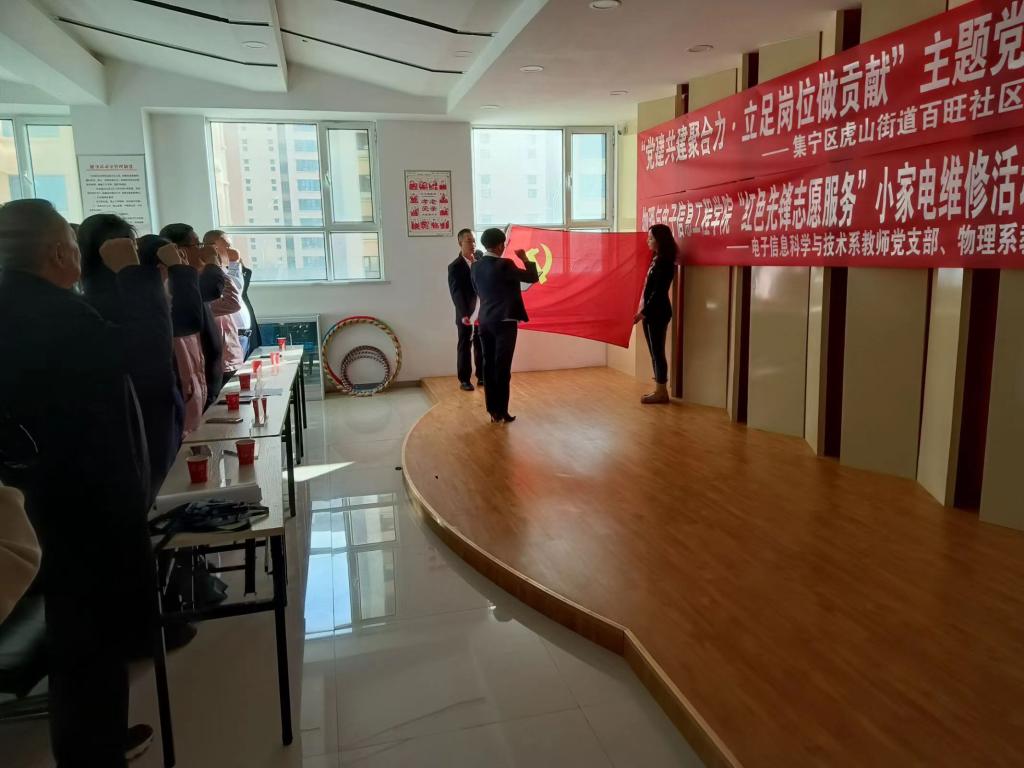 11月16日下午,PP电子游戏平台网站物理与电子信息工程学院电子信息科学与技术系、物理系教师党支部、学生党支部联合虎山街道百旺社区党支部、乌兰察布农商银行党支部开展“党建共建聚合力 立足岗位做贡献”主题党日活动。物理与电子信息工程学院师生党员在社区开展“红色先锋志愿服务”小家电义务维修活动,切实为民办实事。