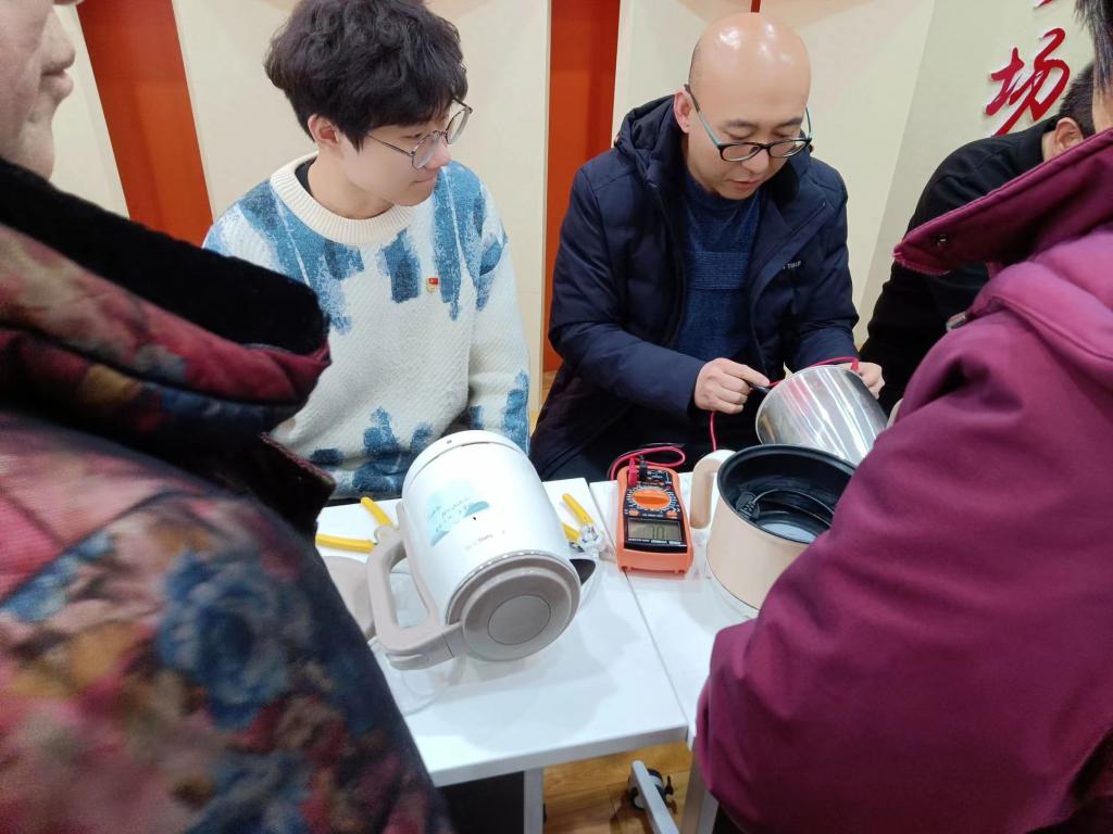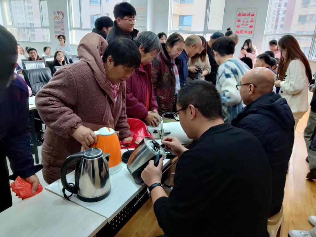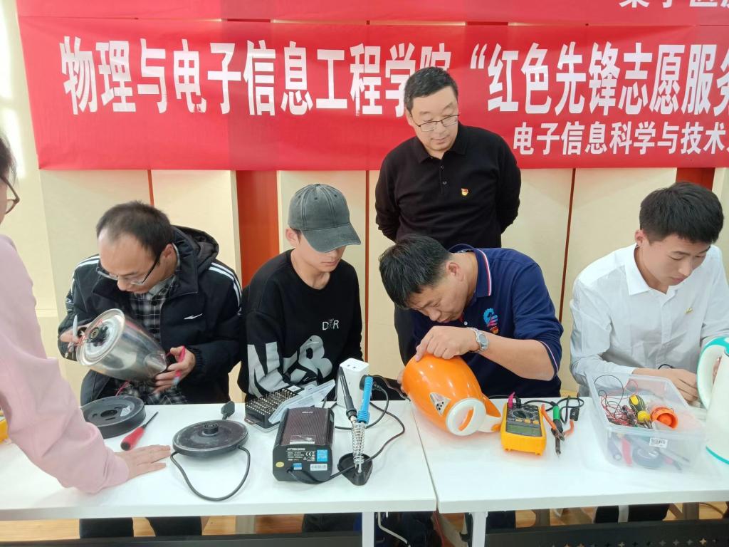 物理与电子信息工程学院师生党员在百旺社区为居民义务维修家电。社区居民带着有故障的电热水壶、电磁炉、电饭锅以及电脑等家电来到志愿服务维修点进行维修。活动现场,党员教师和学生利用自身专业技能仔细、耐心为居民进行故障排查和维修,卸螺丝钉、检测电路、更换零部件、重新安装,积极处理检查出的问题,并向他们普及家电日常使用的注意事项。对于行动不便的社区家庭,师生党员上门义务维修,获得社区居民一致赞扬。