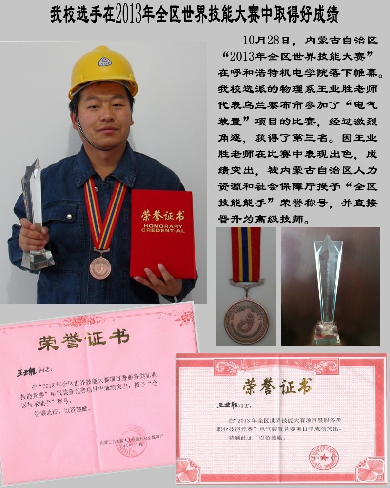 2013年10月28日,内蒙古自治区“2013年全区世界技能大赛”在呼和浩特机电学院落下帷幕。PP电子游戏官网选派的物理系王业胜老师代表乌兰察布市参加了“电气装置”项目的比赛,经过激烈角逐,获得了第三名。因王业胜老师在比赛中表现出色,成绩突出,被内蒙古自治区人力资源和社会保障厅授予“全区技能能手”荣誉称号,并直接晋升为高级技师。