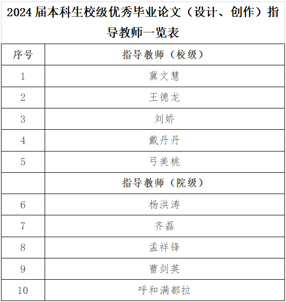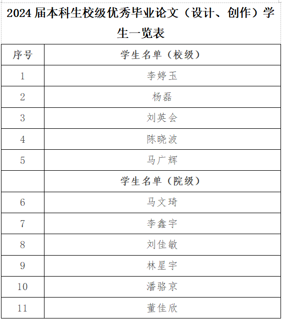 拟确定杨洪涛5名教师为院级优秀毕业论文(设计、创作)指导教师、马文琦6名学生撰写的论文为级优秀毕业论文(设计、创作)现予公示。如有异议,请向学院教学与科研科反映。