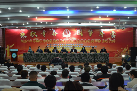 郭晓民宣布2021年全市大学生征兵工作正式启动。主席台就坐的领导共同按下启动仪式按钮。
