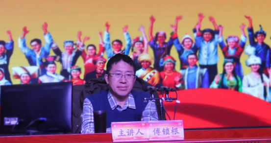 自治区教育系统铸牢中华民族共同体意识宣讲团第十组组长、内蒙古大学马克思主义学院副院长、博士生导师傅锁根教授作主题宣讲