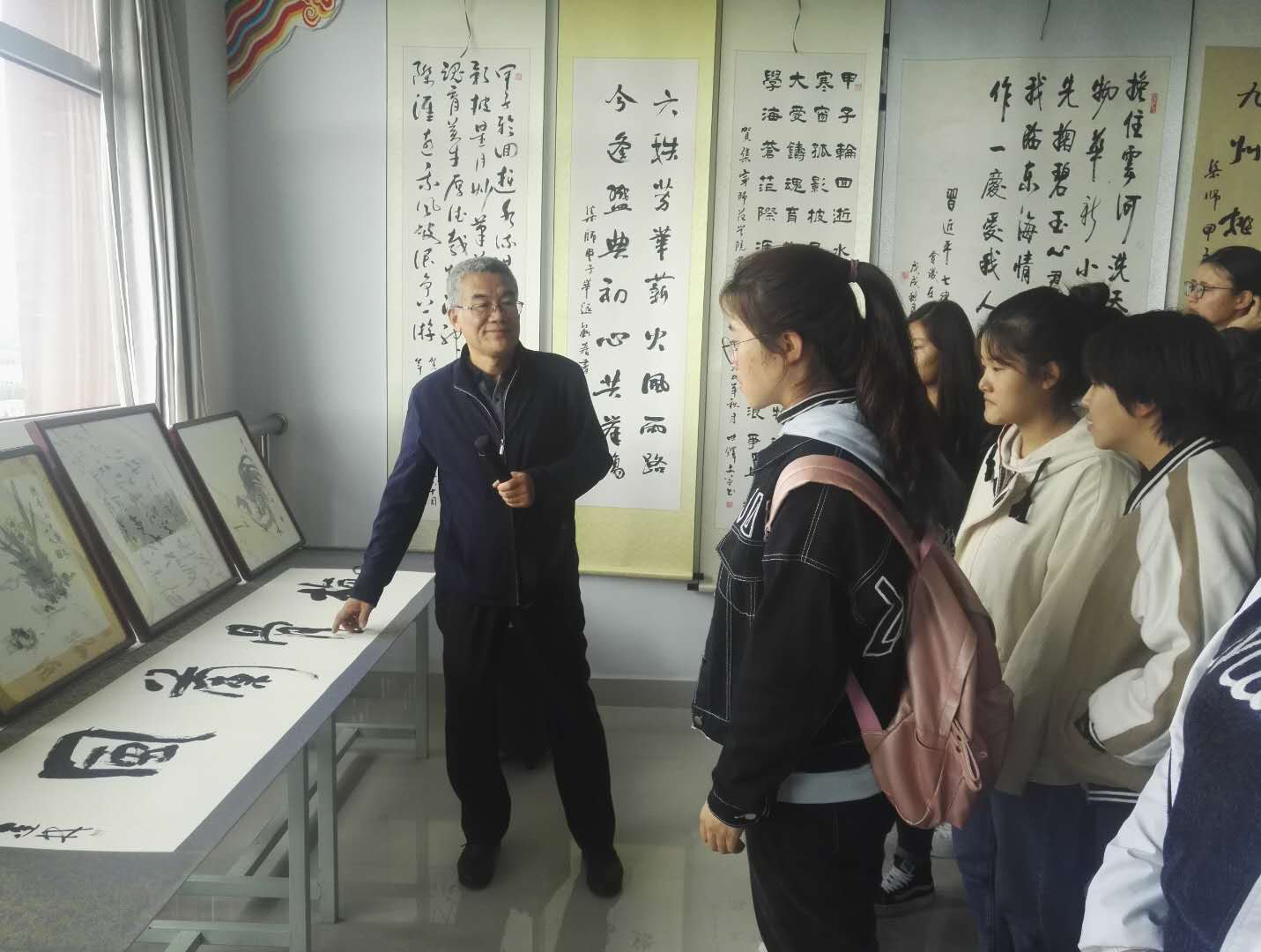 校领导一行与现场的老师和同学们共同欣赏了书画作品,相互交流了对作品的见解和感悟。观展者纷纷对本次活动表示赞扬,对所展示的书画作品给予高度的评价。