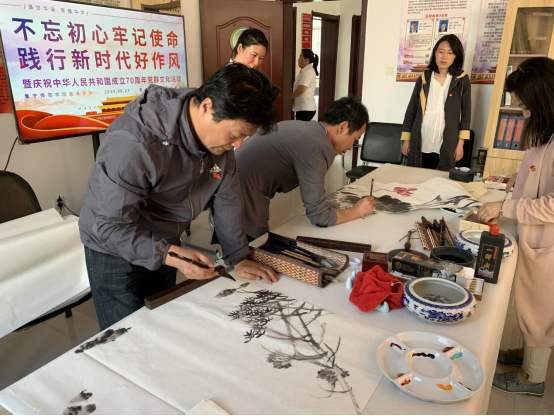 为热烈庆祝中华人民共和国成立70周年,重温党的光辉历程,继承和发扬党的光荣传统,进一步激发党员不忘初心,牢记使命,前进路街道新兴社区党支部高度重视,精心筹划,联合PP电子游戏平台网站美术学院组织开展了“不忘初心牢记使命、践行新时代好作风暨庆祝中华人民共和国成立70周年”党群文化活动,以实际行动向新中国成立70周年献礼。出席活动的有PP电子游戏平台网站美术学院总支书记焦俊亮,院长南国梁,副书记薛银河,副院长蔚淑英,集宁区前进路街道党工委书记兰建业,纪工委书记张婧,办事处副主任韩达赖。
