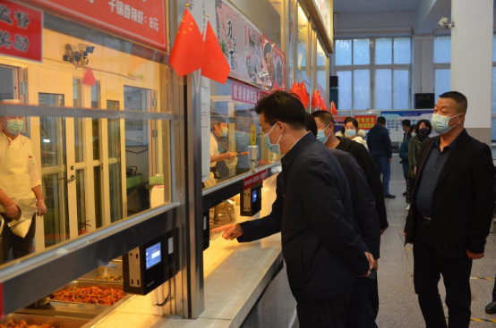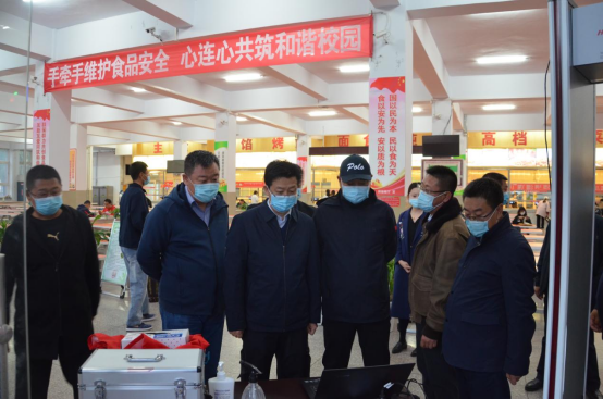 朱书记一行在主教楼及学生食堂检查测温仪的使用情况,询问食堂负责人有关物资储备、菜品菜谱、安全防护等方面工作的细节问题。他要求后勤部门做好在校学生的伙食供应,统计好、把控好学生就餐流量,避免人员聚集。