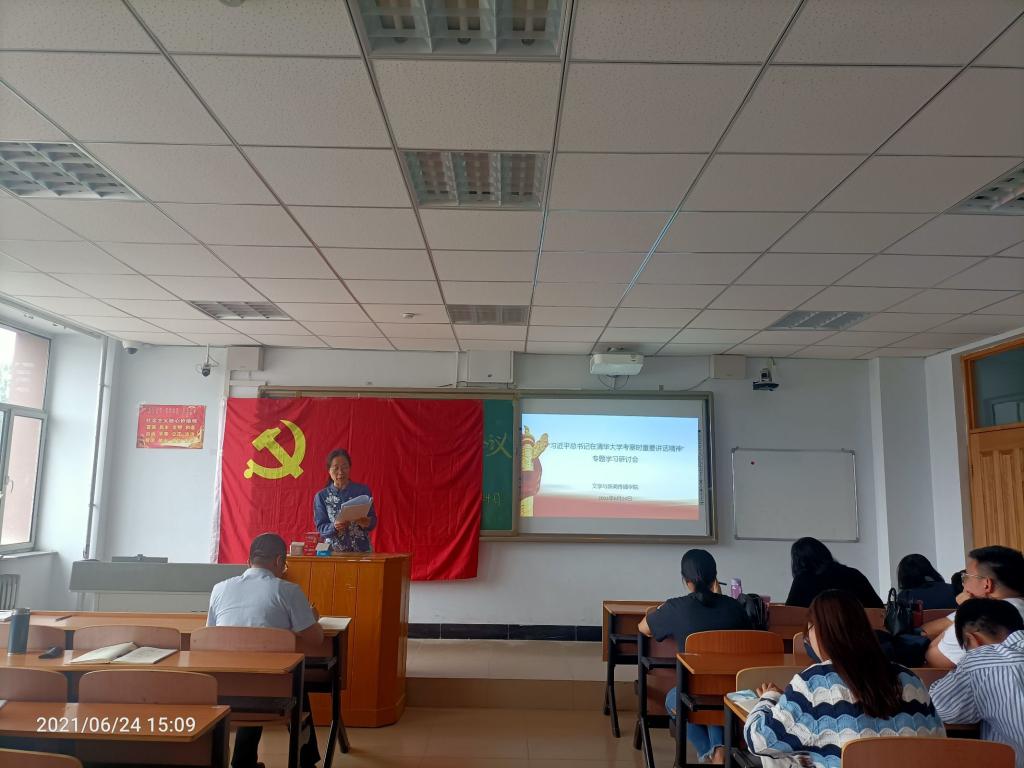 文学与新闻传播学院教师党员郝青山领学了习近平总书记在清华大学考察时重要讲话精神的内容。