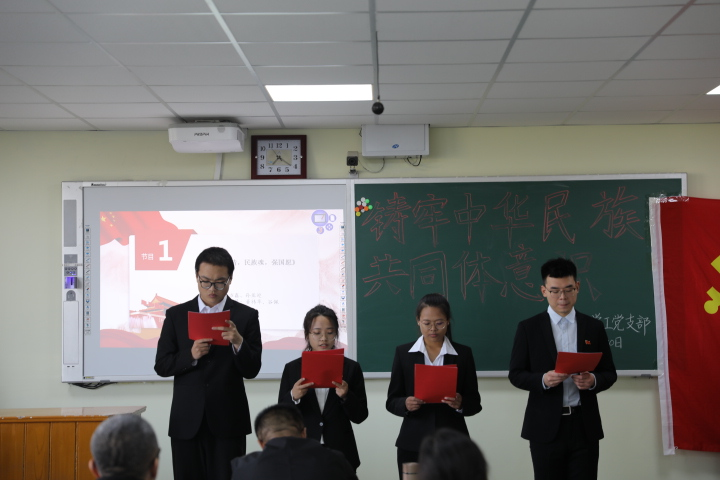 学生党员方鑫等四人朗诵了爱国诗歌《爱国情 民族魂 强国愿》;吴纪委等四名党员讲述了人民公仆孔繁森扎根西藏和藏族同胞鱼水情深的民族团结故事;21级少数民族学生合唱《歌唱祖国》……活动紧扣主题,在一个个节目中使我们深刻感受到中华民族伟大的凝聚力,感受到中国共产党人无私奉献大无畏的革命气质和五十六个民族同胞同舟共济,奋勇拼搏“共圆伟大中国梦”的强大力量。