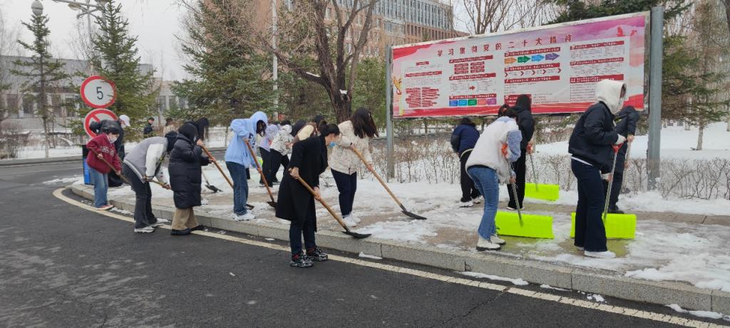 同学们团结协作,有序地扫积雪、铲冰层、除路障。天寒地冻挡不住大家的热情,铁锹声此起彼伏,忙碌的身影成为校园里一道亮丽的风景线。通过一上午的共同努力,区域内主要道路的积雪被清扫干净,还给师生一条干净整洁的通道,确保了出行的安全。