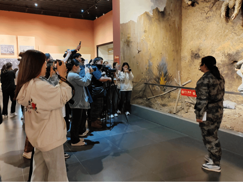 在讲解员的带领下,学生们认真聆听集宁战役的历史背景、战斗过程和重大意义。一幅幅珍贵的历史照片、一件件饱经沧桑的文物,生动地再现了当年集宁战役的激烈场景。学生们不时驻足观看,拿起相机,以新闻人的视角去观察、去记录,为后续的新闻创作积累素材。