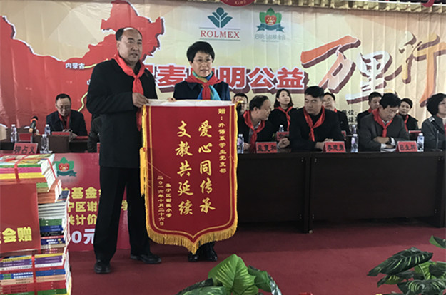 11月10日,在“阅读点亮人生”启明公益万里行谢臣小学图书捐赠仪式上,谢臣小学校长将一面“支教共延续 爱心同传承”的锦旗赠予外语系党总支,对外语系党总支一年来开展的志愿服务活动表示感谢。
