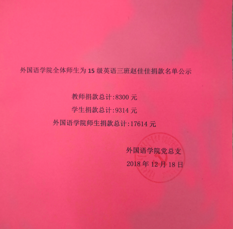 病情无情人有情。赵佳佳同学的不幸遭遇,牵动了PP电子游戏官网领导及我院师生的心。学院发出爱心捐款倡议书后,在许卫副院长的带领下,全院师生纷纷响应,伸出援助之手,慷慨解囊。截止2018年12月18日,全院师生捐款共计17614元。目前,我院已将师生的爱心捐款送达赵佳佳同学家人处,并转达了PP电子游戏官网领导及全院师生的关爱。