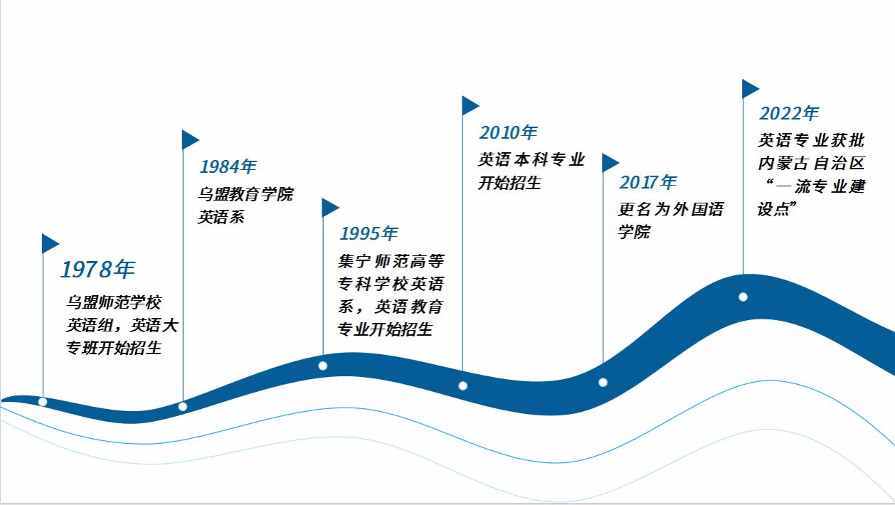 外国语学院始建于 1978 年,其前身为乌盟师范学校大专班英语组,自成立之初便肩负起为地区培养急需英语师资的重任,开启了服务地方基础教育的师范教育征程。历经多年的变迁与发展,在学校晋升为本科院校后,2010 年开始招收英语专业本科生。迄今为止,已向基础教育事业输送了 3000 余名德才兼备的优秀英语教师,为乌兰察布及周边地区的基础教育发展作出了重大贡献。