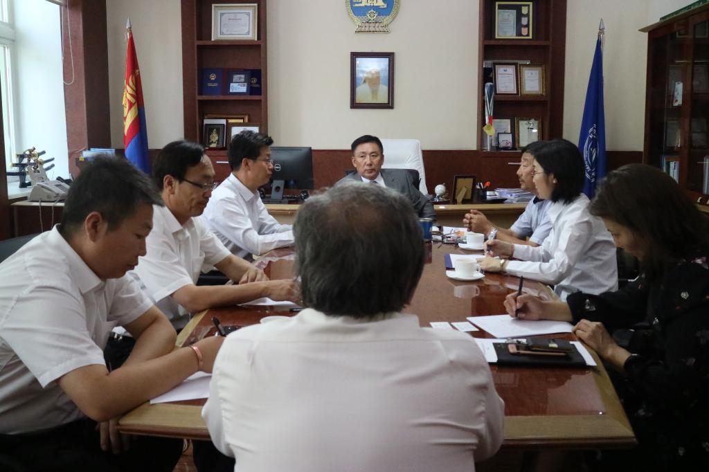 7月5日,朱玉东一行访问乌兰巴托大学,与乌兰巴托大学常务副校长斯·朝鲁门,分管教学副校长昂哈巴雅尔,博士、硕士研究生管理处主任苏格力玛,财务管理处主任图雅,外事办主任胡兰进行了座谈。座谈会上,斯·朝鲁门、昂哈巴雅尔、苏格力玛分别发言,主要围绕招收研究生、博士生;“2+2”模式联合培养本科生;共同召开国际学术研讨会;夏令营学生教师互访和双方开展田野调查等内容。