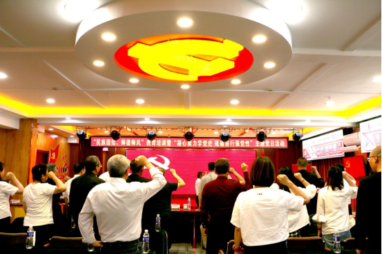 回到集宁,在宏星院报告厅,由党总支书记史敏领誓,全体党员重温了入党誓词,观看了革命情景诗朗诵,进行了结业总结。